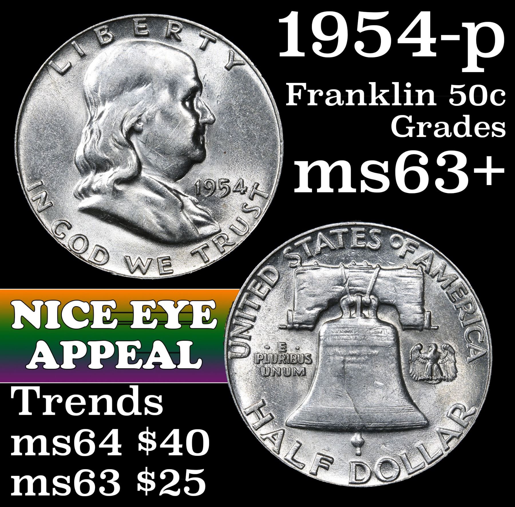 1954-p Franklin Half Dollar 50c Grades Select+ Unc.