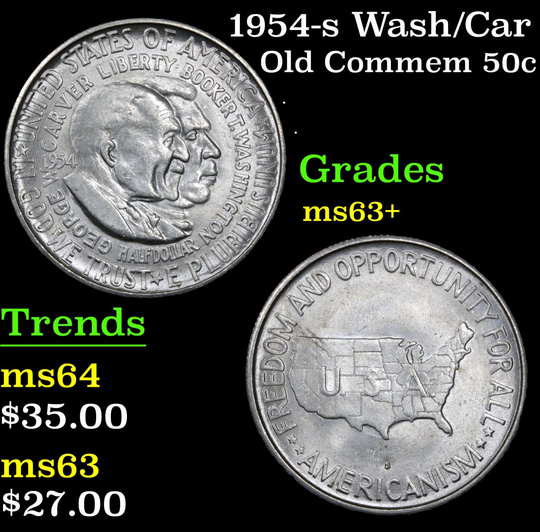 1954-s Wash/Car Old Commem Half Dollar 50c Grades Select+ Unc. The Final Coin in the Old Commemorative Program. It was Minted to Revive the Ending Booker T Washington Commemorative and to Honor Washington Carver. When examining a Wash/Carver examine the High Points, which are Carver's cheek on the Obverse and the Center of the USA on the Reverse.