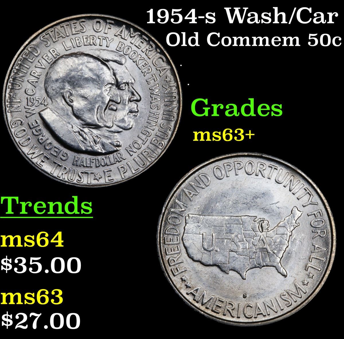 1954-s Wash/Car Old Commem Half Dollar 50c Grades Select+ Unc. The Final Coin in the Old Commemorative Program. It was Minted to Revive the Ending Booker T Washington Commemorative and to Honor Washington Carver. When examining a Wash/Carver examine the High Points, which are Carver's cheek on the Obverse and the Center of the USA on the Reverse.