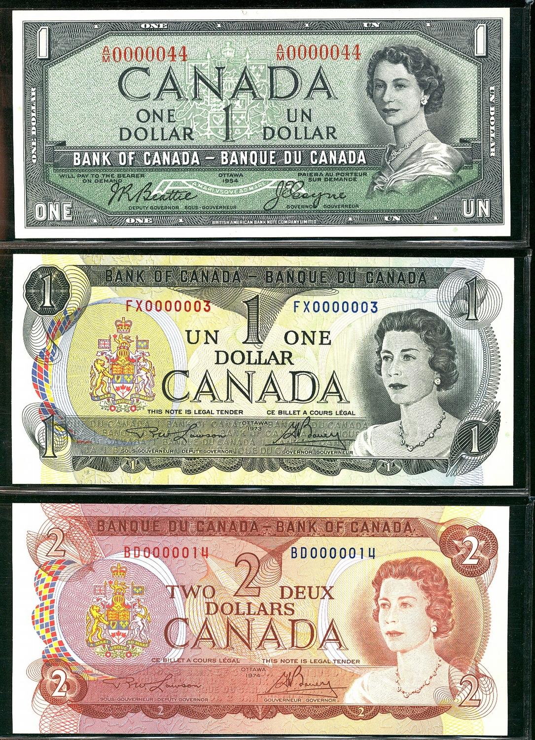 1954 to 1974 Low Serial Numbered notes. Includes 1954 $1 BC-37a #AM0000044, 1973 $1 BC-46a #FX0000003 & 1974 $2 BC-47a #BD0000014. Lot of 3 UNC notes.