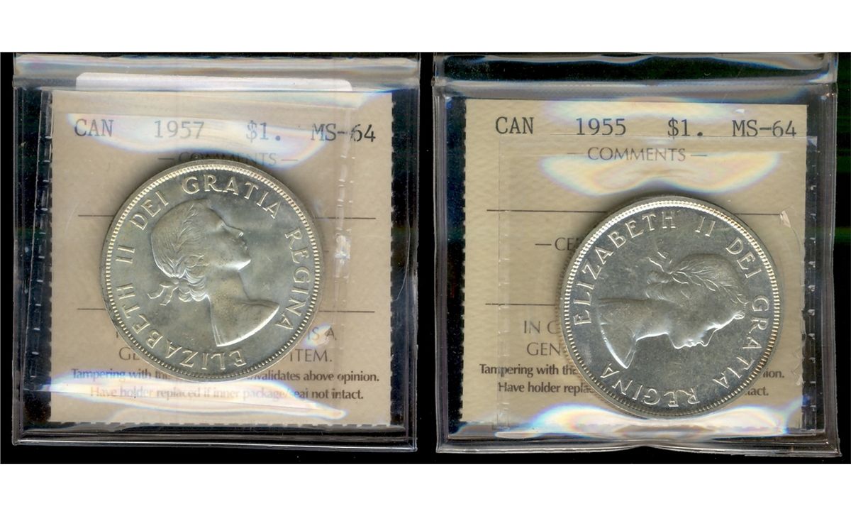 1955 $1 & 1957 ICCS MS64. Lot of 2 coins.