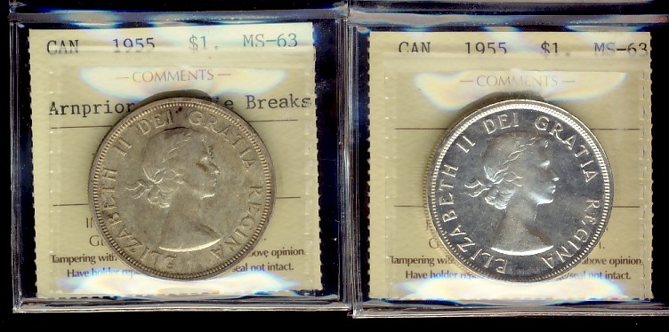 1955 $1 Arnp w/DB & 1955 reg ICCS MS63. Lot of 2 coins.
