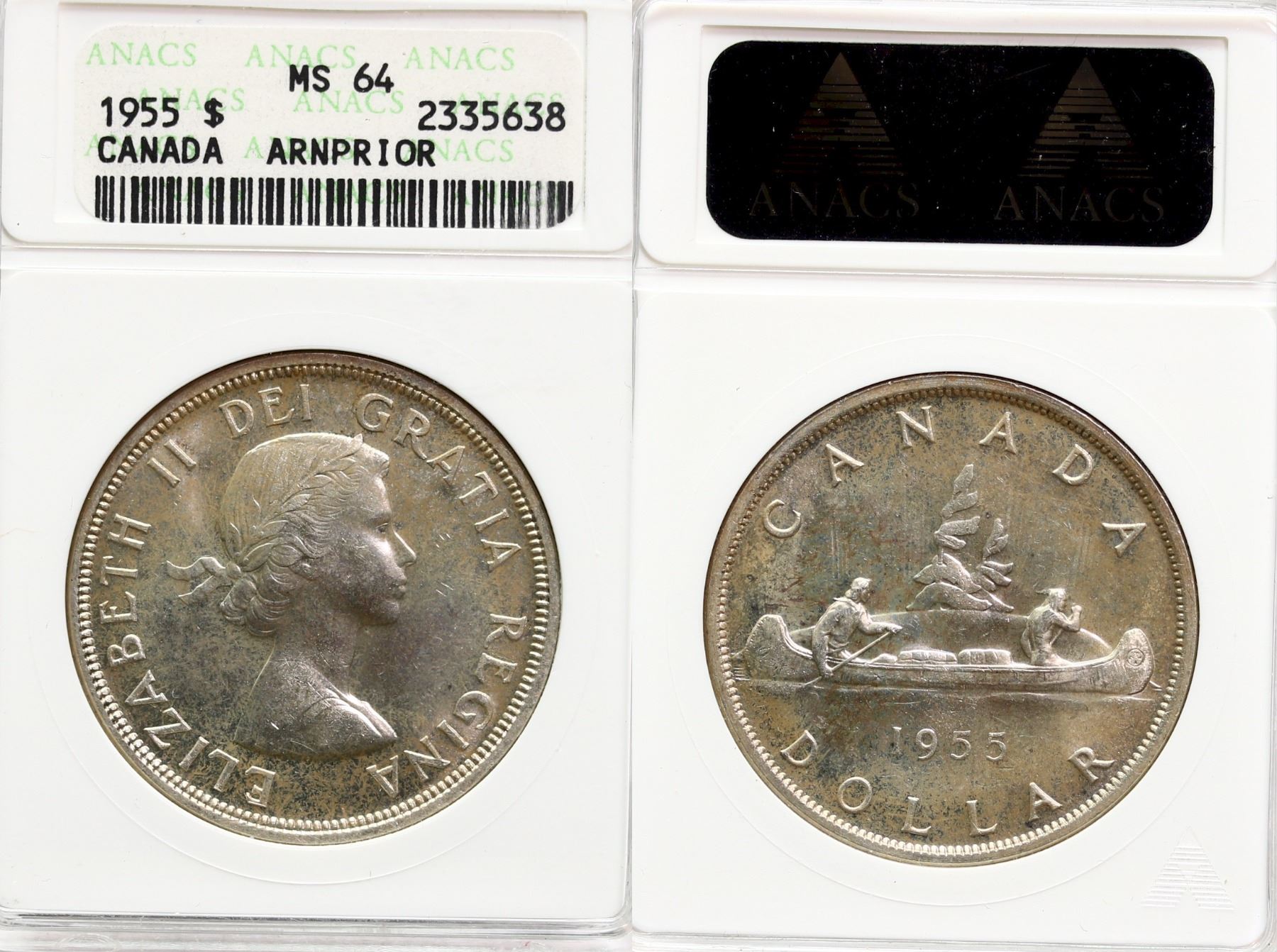1955 $1 "Arnprior - No D/B" ANACS Very Choice Mint State-64, Brilliant and lustrous with hint of golden tone.