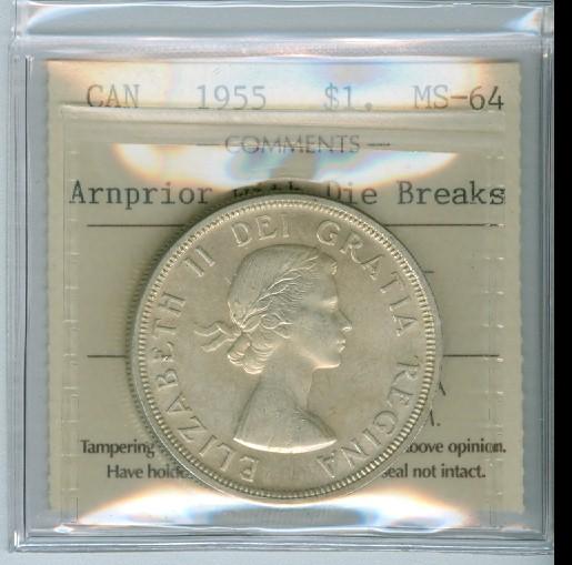 1955 $1 Arnprior w/DB ICCS MS64. Lustrous white issue.