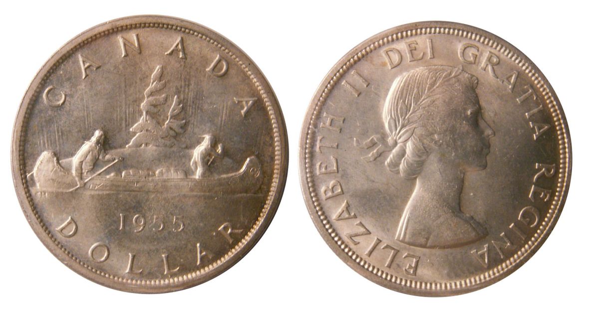 1955 $1 Arnprior w/DB ICCS MS65. Tied for finest graded. Light creamy and satiny lustre. A near perfect example. This coin presents an important opportunity for Registry Set collectors. Tied with only one other example.