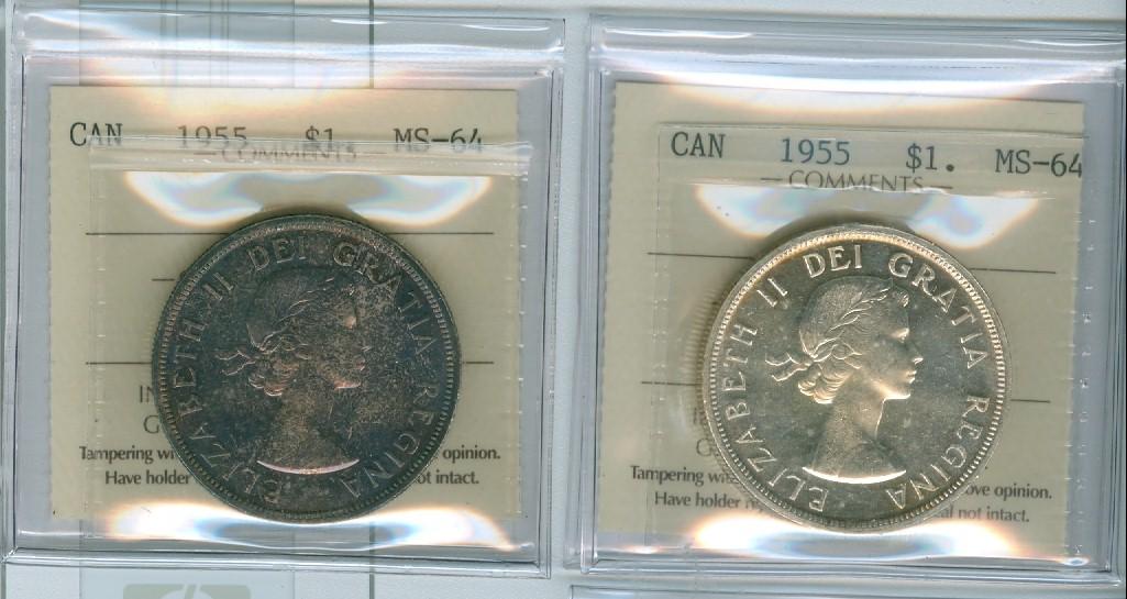 1955 $1 ICCS MS64. Lot of 2 coins, one toned and the othe blast white.