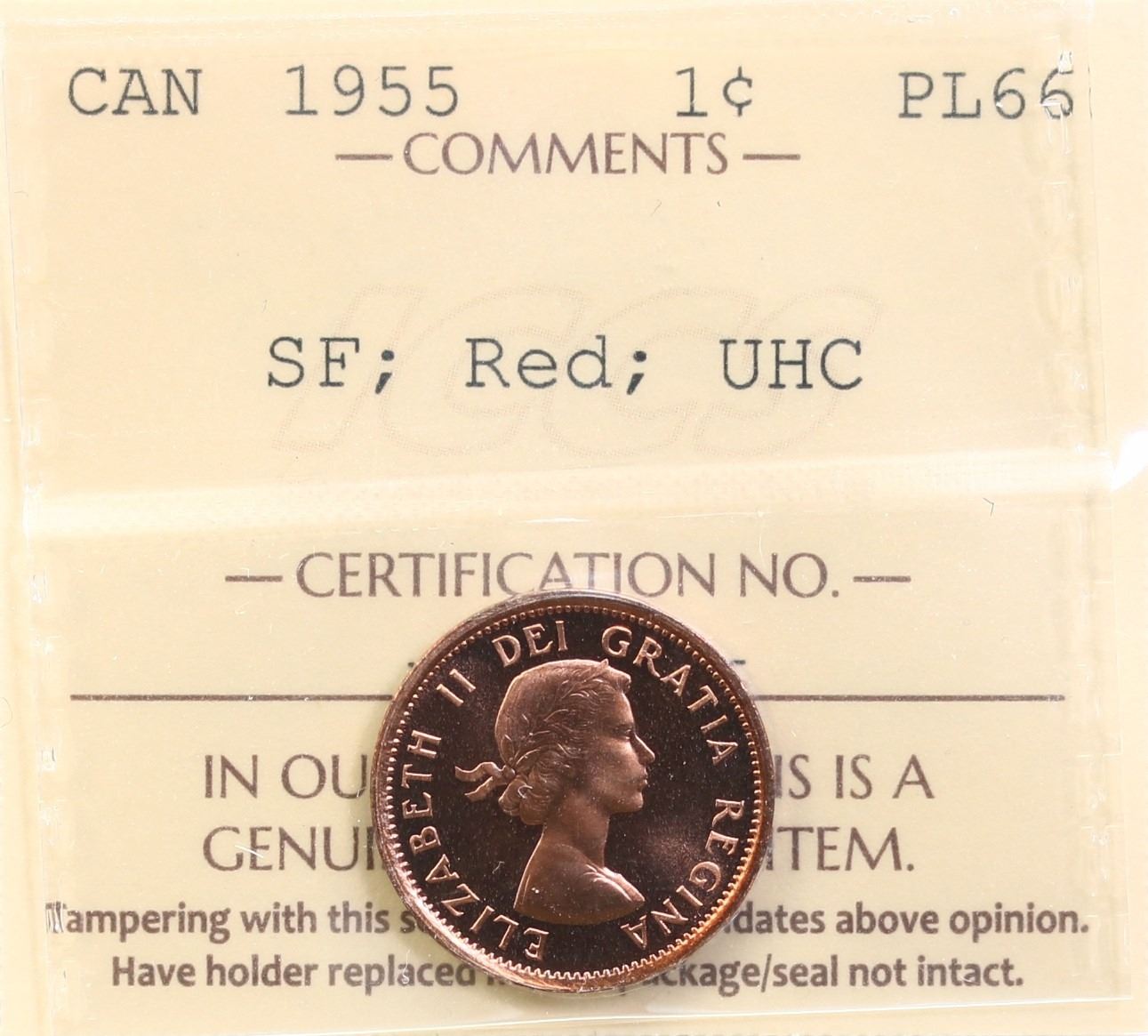 1955 1¢ ICCS Superb Gem Proof-like-66 Red, Ultra Heavy Cameo. A popular and difficult coin to encounter with such a deep ultra heavy cameo finish. The fields are watery and deep, a bright mint red at one angle and pitch black when viewed directly, due to the deep reflectivity of the fields. The striking cameo contrast is abundant and the eye appeal is exceptional. Extremely difficult to find in this level of preservation and with such remarkable cameo contrast. A fun coin for the proof-like specialist to pursue, a finer example would surely be difficult to locate.