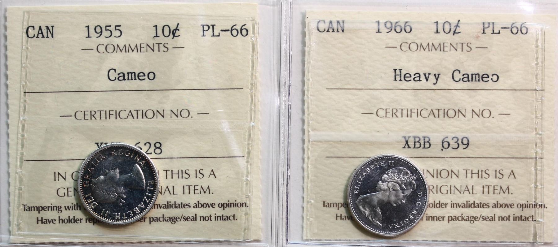 1955 10¢, 1966. Both coins ICCS Superb Gem Proof-Like-66 Cameo