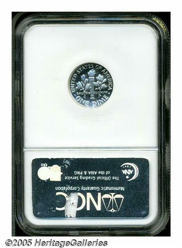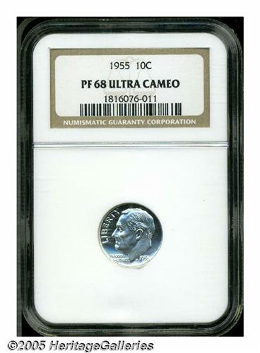 <B>1955<10C> PR68 Ultra Cameo NGC.</B></I> Deeply frosted devices rise in splendor above the glasslike fields. An exquisite piece worthy of the most demanding specialist. Population: 13 in 68 Ultra Cameo, 3 finer (6/05).