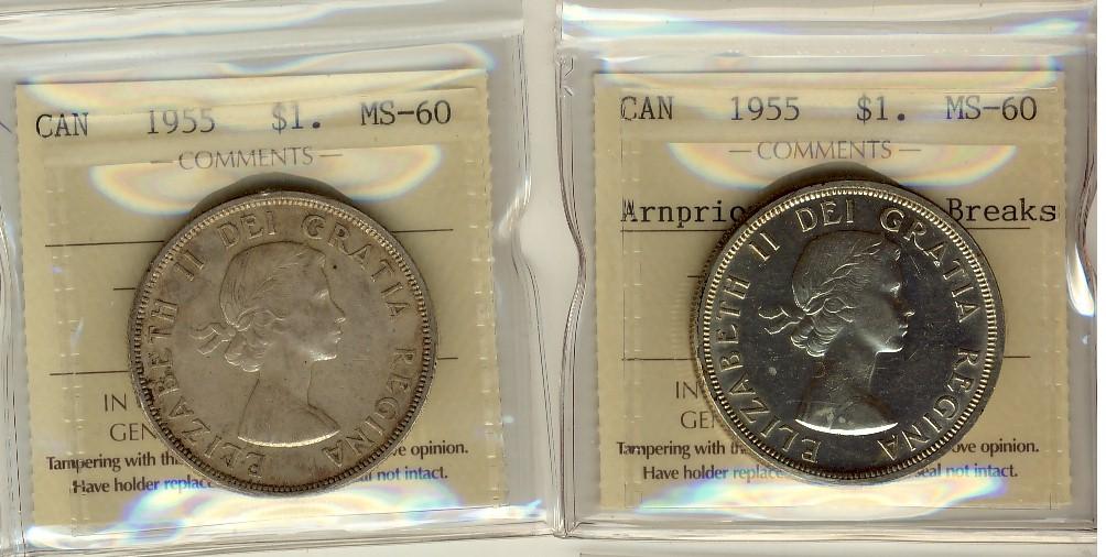 1955, 1955 Arnprior $1 with Die Breaks, both ICCS MS60
