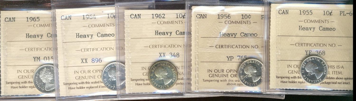 1955, 1956, 1962, 1964, 1965 ICCS PL66 Heavy Cameo, Lot of 5 coins,