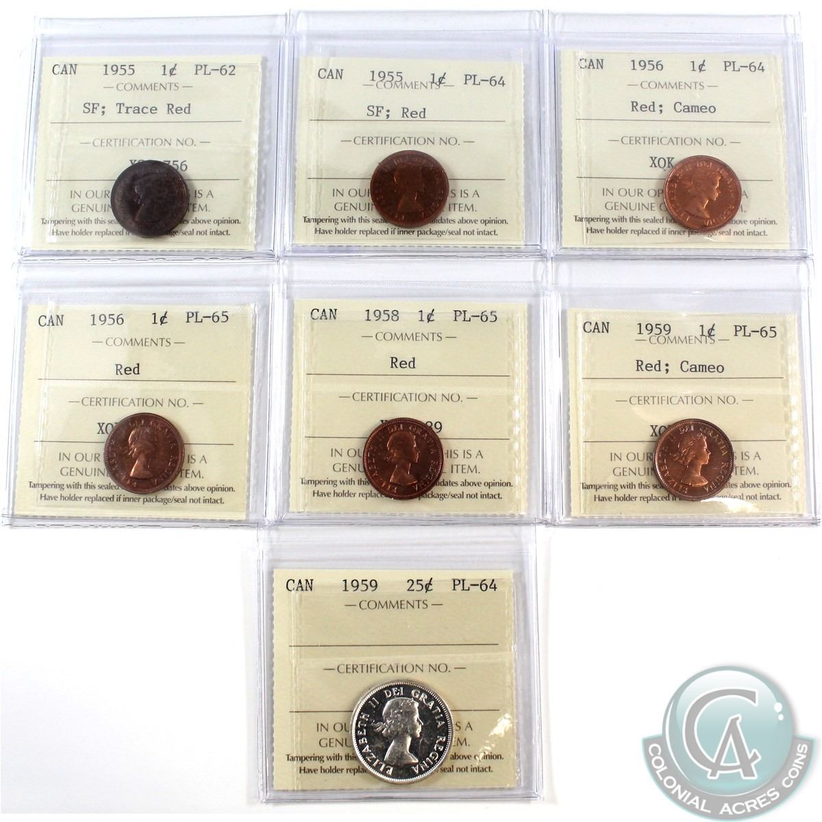 1955-1959 Canada ICCS Certified Lot. You will receive the following; 1955 1-cent SF PL-62 Trace Red, 1955 1-cent SF PL-64 Red, 1956 1-cent PL-64 Red; Cameo, 1956 1-cent PL-65 Red, 1958 1-cent PL-65 Red, 1959 1-cent PL-65 Red; Cameo, 1959 25-cent PL-64. 7pcs.