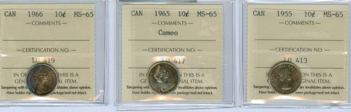 1955, 1965 Cameo and 1966. All nicely toned. Lot of 3 ICCS graded 10¢ coins, all MS65.