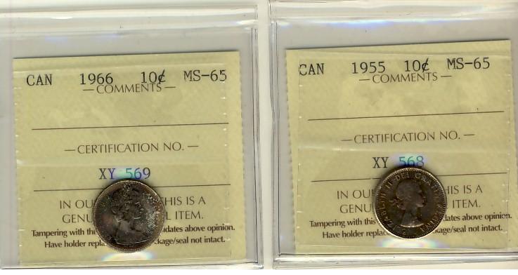 1955 & 1966 10¢ ICCS MS65. Lot of 2 coins.