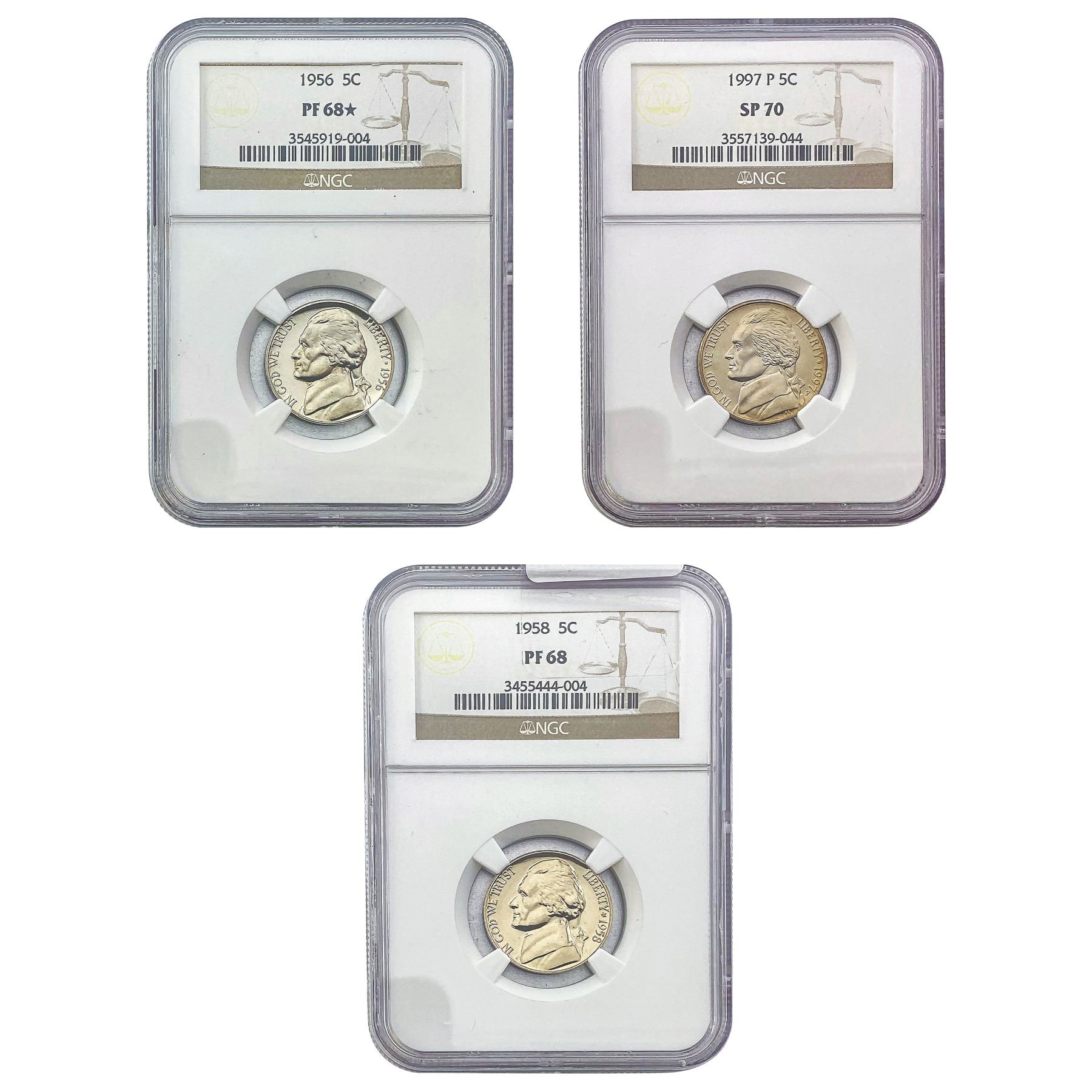 1955-1997 FALSE NGC SP/PF68/70 Gem Proof Jefferson Nickel Lot [3 Coins]