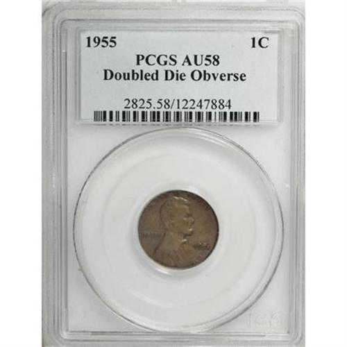 <B>1955 1C Doubled Die Obverse AU58 PCGS.</B></I> Nearly full luster with pleasing olive-brown surfaces. This sharp example has a trace of highpoint wear to limit the grade. The popular and dramatic 1955 doubled die cent is always a collector favorite.<BR><BR><B>Coin Engraver:</B> Victor D. Brenner<BR><BR><b>Shipping:</b> Coins & Currency (<a target="_blank" href="http://www.heritageauctions.com/common/shipping.php">view shipping information</a>)