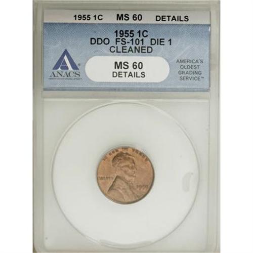 <B>1955 1C Doubled Die Obverse--Cleaned--ANACS. MS60 Details.</B></I> FS-101, formerly FS-021.8. Die pair One. This is a pleasing red-gold specimen with plenty of remaining luster and minimal effects from improper cleaning. A few carbon flecks and a handful of tiny contact marks are noted on the two sides.<BR><I>From The New York Eye Appeal Collection, Part Three.</B></I><BR><BR><B>Coin Engraver:</B> Victor D. Brenner<BR><BR><b>Shipping:</b> Coins & Currency (<a target="_blank" href="http://www.heritageauctions.com/common/shipping.php">view shipping information</a>)