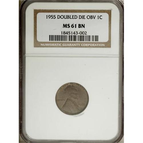 <B>1955 1C Doubled Die Obverse MS61 Brown NGC.</B></I> Lovely chocolate and reddish-brown surfaces with hints of lilac toning that is faded from original mint red. Microscopic abrasions on each side prevent a higher grade, but the overall eye appeal is excellent for the level assigned.<BR><BR><B>Coin Engraver:</B> Victor D. Brenner<BR><BR><b>Shipping:</b> Coins & Currency (<a target="_blank" href="http://www.heritageauctions.com/common/shipping.php">view shipping information</a>)