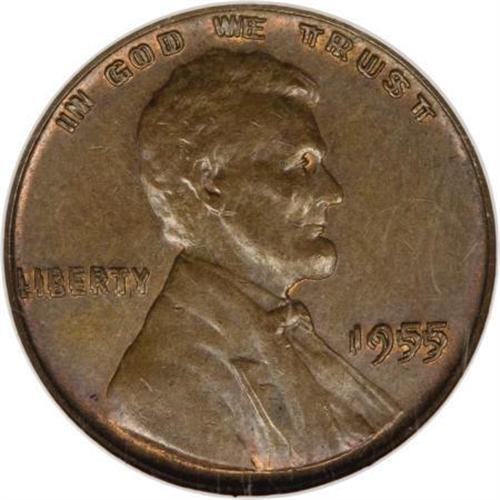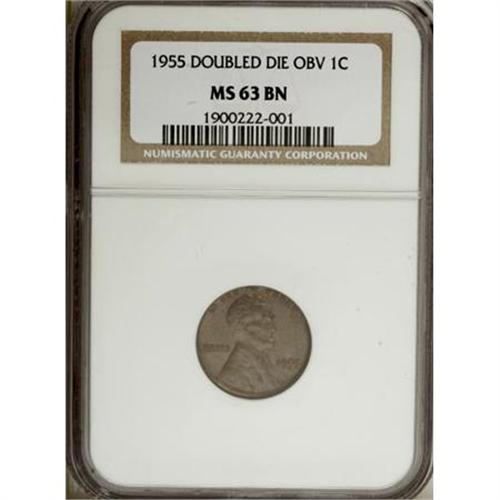 <B>1955 1C Doubled Die Obverse MS63 Brown NGC.</B></I> FS-101. Some mint red continues to cling to the surfaces despite the Brown designation, and the smooth surfaces are glossy brown elsewhere. This is a coin that now has appealed to decades of collectors, one that never fails to startle almost as powerfully as it did when the first examples were uncovered some 50-plus years ago. <BR><BR><B>Coin Engraver:</B> Victor D. Brenner<BR><BR><b>Shipping:</b> Coins & Currency (<a target="_blank" href="http://www.heritageauctions.com/common/shipping.php">view shipping information</a>)