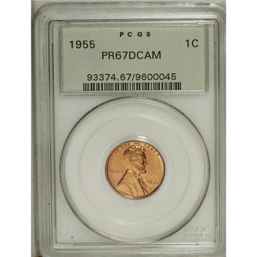 <B>1955<1C> PR67 Deep Cameo PCGS.</B></I> A gorgeous near flawless coin. Fields are totally mirrored surrounding Lincoln's bold visage that has the cameo contrast so sought after in Lincoln cents from the 1950s. The reverse is equally as desirable. A great coin. Population: 20 in 67, 6 finer (8/06).