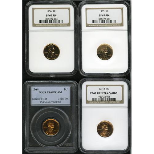 <B>1955 1C PR67RD NGC; 1956 PR69RD NGC; 1964 PR69 Deep Cameo PCGS</B></I> and a <B>1971-S PR68RD Deep Cameo NGC.</B></I><BR><BR><b>Shipping:</b> Coin/Currency (<a target="_blank" href="http://www.heritageauctions.com/common/shipping.php">view shipping information</a>)