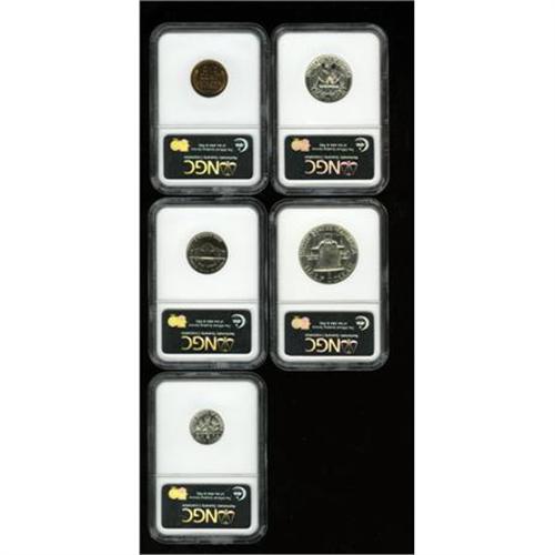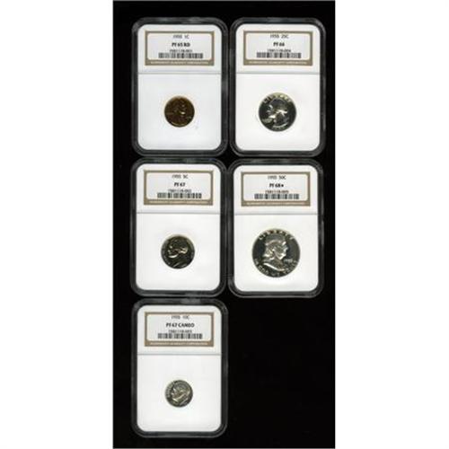 <B>1955 SET Proof Set PR65 thru PR68 NGC. </B></I>This set includes a <B>1955 1C PR65 Red NGC; 1955 5C PR67 NGC; 1955 10C PR67 Cameo NGC; 1955 25C PR66 NGC </B></I>and a<B> 1955 50C PR68<img border='0' src='http://www.heritagecoins.com/images/star.gif' width=10 height=10> NGC. <BR></B></I><BR><BR><B>Coin Engraver:</B> Victor D. Brenner<BR><BR><b>Shipping:</b> Coins & Currency (<a target="_blank" href="http://www.heritageauctions.com/common/shipping.php">view shipping information</a>)