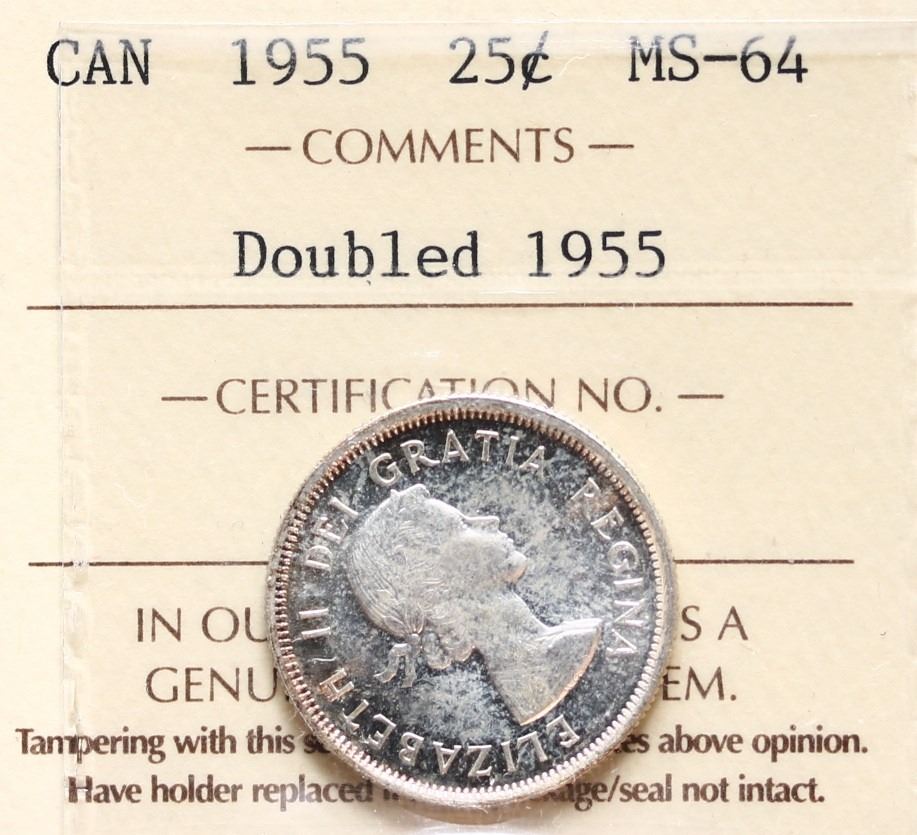 1955 25¢ "Double 1955 ' ICCS Choice Mint State-64.