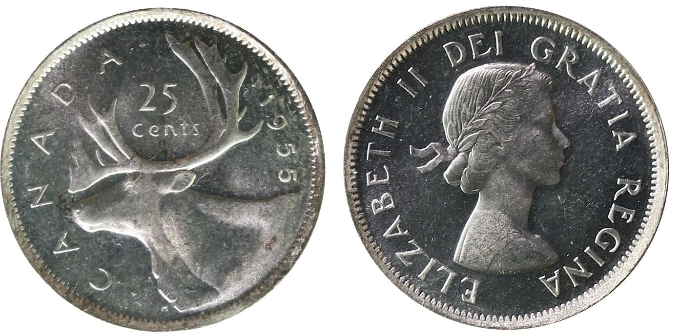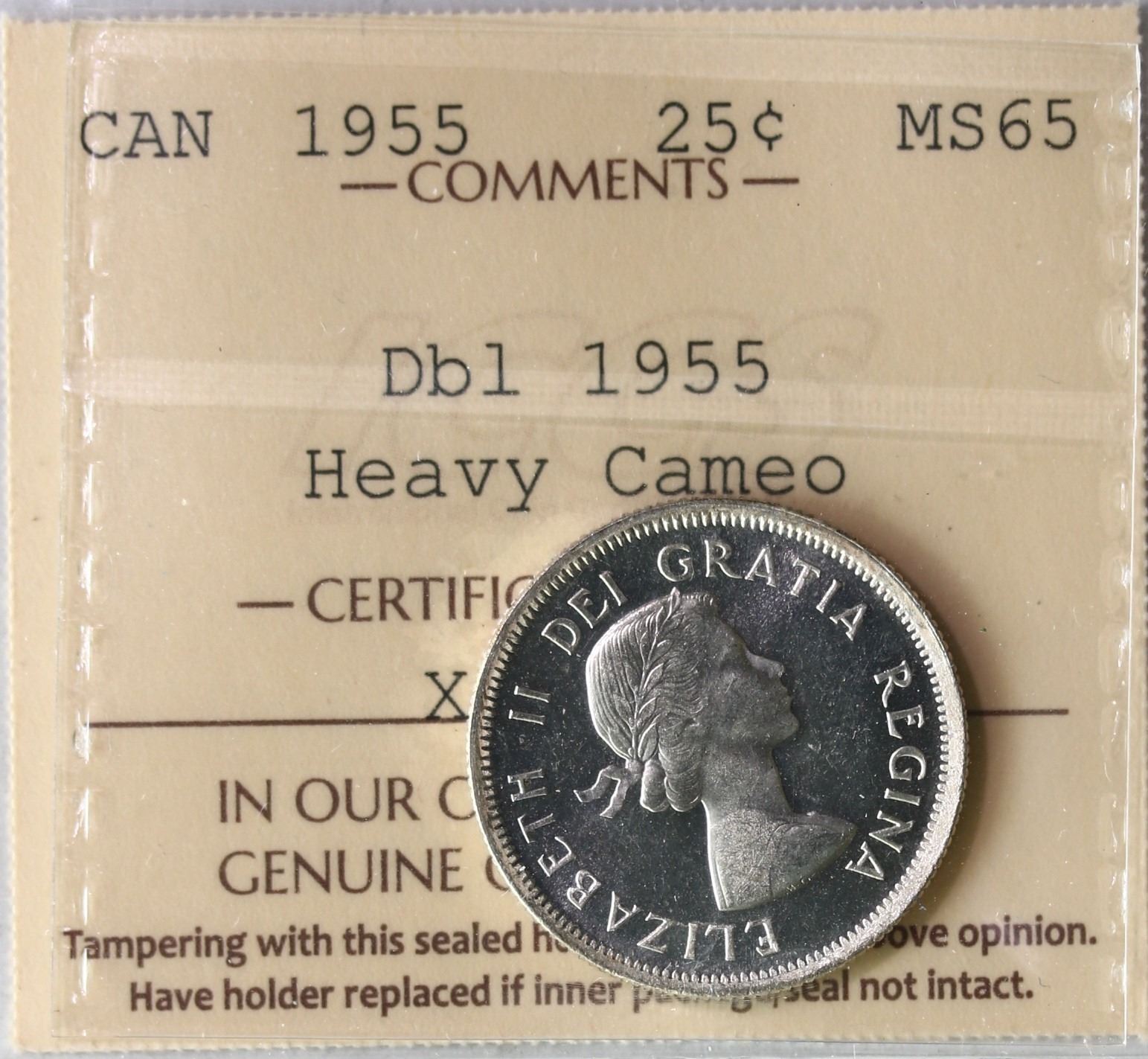 1955 25¢ "Double date - 1955" ICCS Gem Mint State-65 Heavy Cameo. Fully brilliant and lustrous. Very popular and sought after variety.
