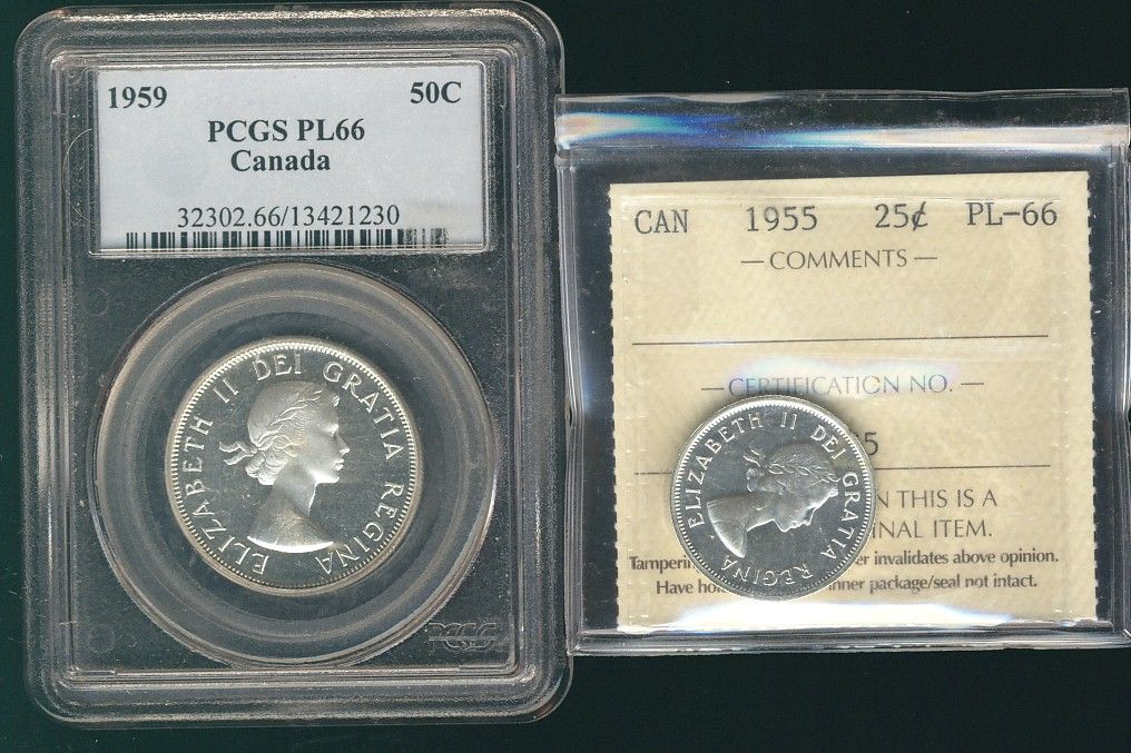 1955 25¢ ICCS & 1959 50¢ PCGS. Lot of 2 coins both PL66.