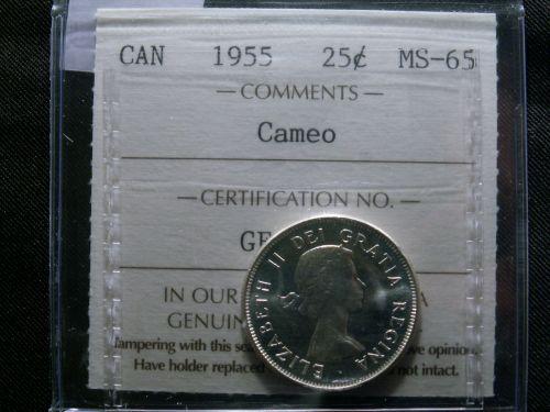 1955 25¢ ICCS MS65 Cameo. Fully white and lustrous. Very seldom offered in Gem. Despite all catalogues. Worth a premium bid!