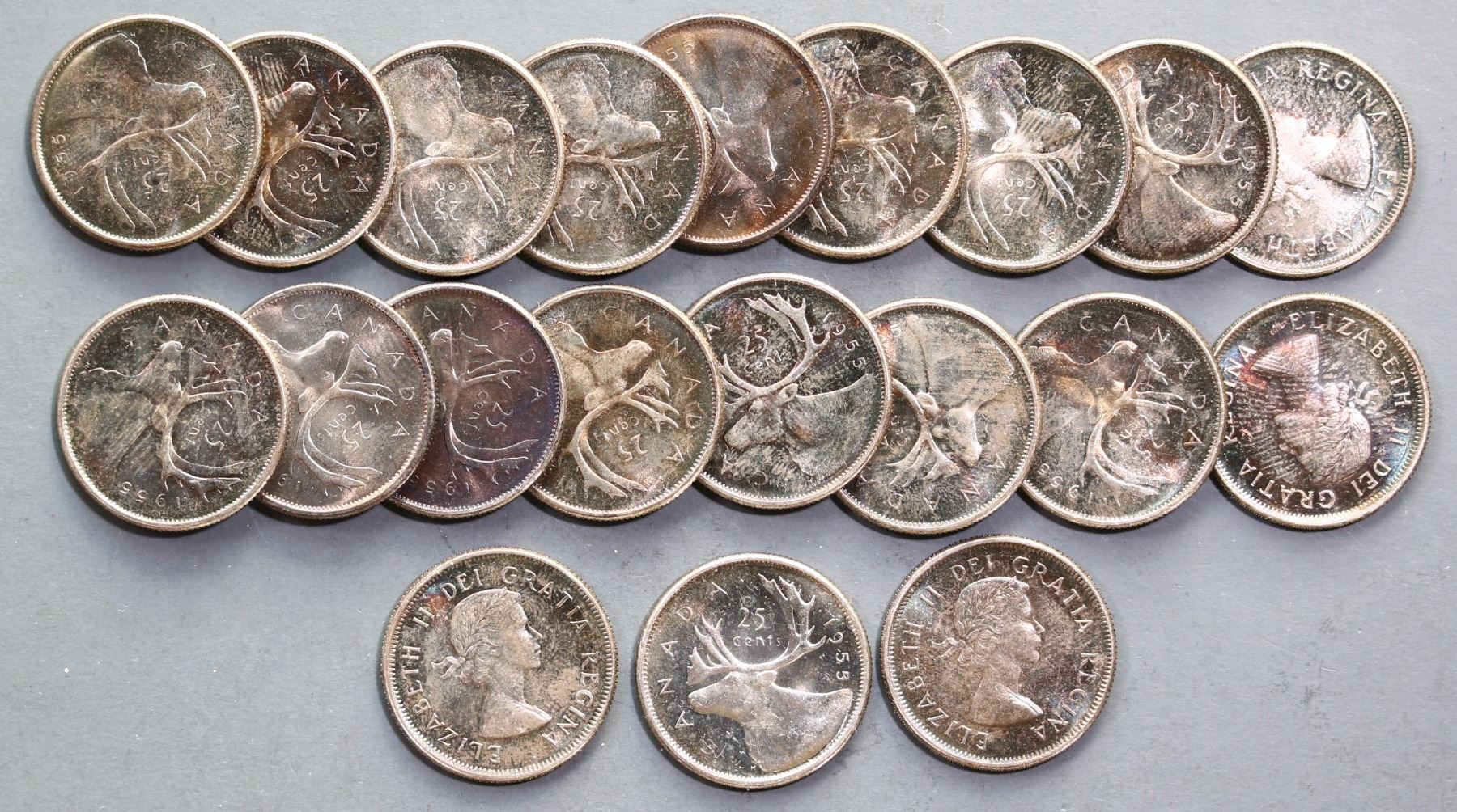 1955 25¢ Lot of 20 superbly toned MS to BU examples. See Pic.