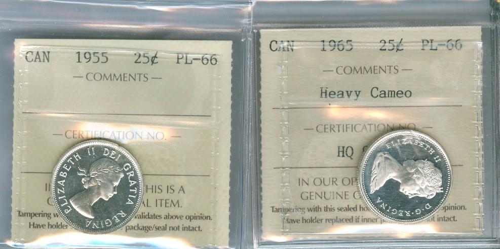 1955 25¢ PL66 & 1965 25¢ PL66 Hvy Cam. Lot of two coins both ICCS graded.