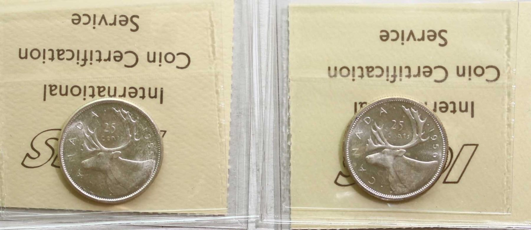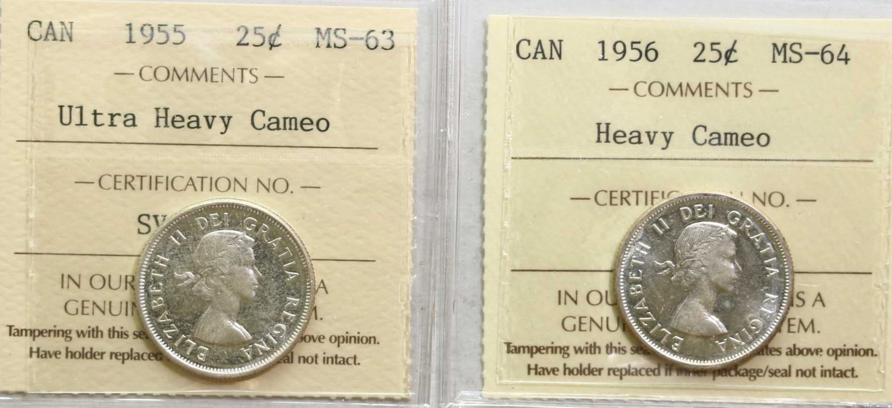 1955 25¢ Ultra Heavy Cameo, 1956 Heavy Cameo Both coins ICCS Choice Mint State-63 & Very Choice Mint State-64 respectively.