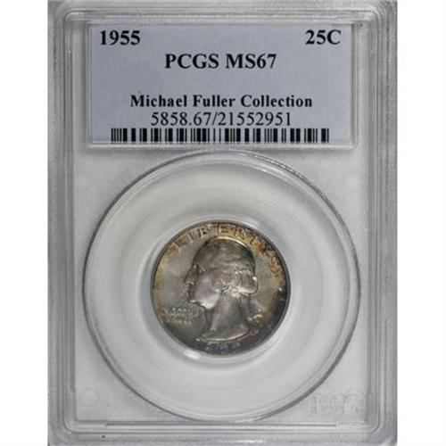 <B>1955 25C MS67 PCGS.</B></I> Amber, golden-brown, and violet-blue patina appears against a backdrop of sea-green and silver-gray. An exactingly struck and highly lustrous piece, tied for the finest-certified by either NGC or PCGS (10/07). <BR><I>From The Michael Fuller Collection.</B></I><BR><BR><B>Coin Engraver:</B> John Flanagan<BR><BR><b>Shipping:</b> Coins & Currency (<a target="_blank" href="http://www.heritageauctions.com/common/shipping.php">view shipping information</a>)