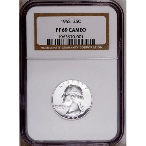 <B>1955 25C PR69 Cameo NGC.</B></I> Fully struck and pristine, with jet-black fields and frosted silver-gray devices. Census: 23 in 69 Cameo, 0 finer in Cameo condition (12/05).