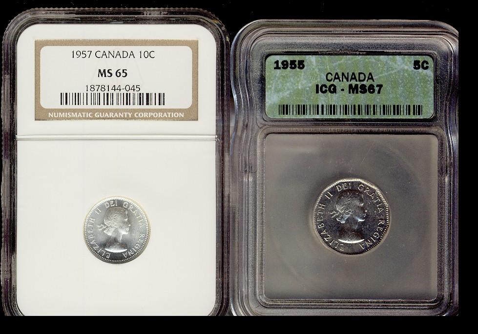 1955 5¢ ICG MS67 & 1957 10¢ NGC MS65. Lot of 2 coins both white and lustrous. Should be viewed.