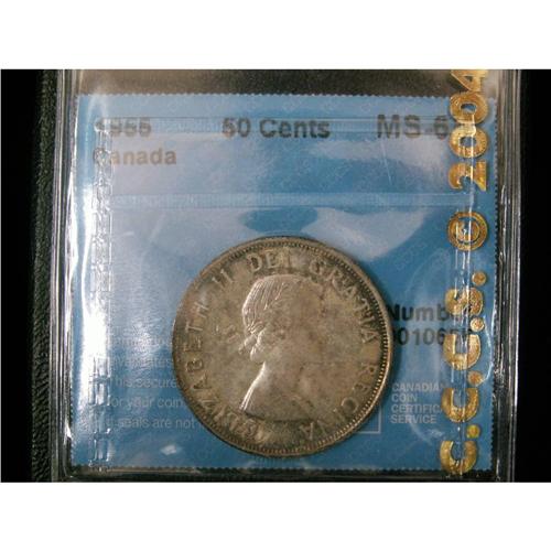 1955 50¢ CCCS graded MS-65, light russet tones over full underlying luster. A lovely example. Rare this nice.