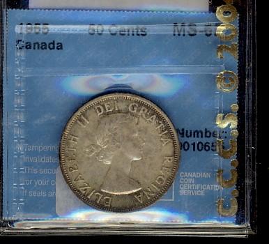 1955 50¢ CCCS graded MS-65, light russet tones over full underlying luster. A lovely example. Rare this nice.