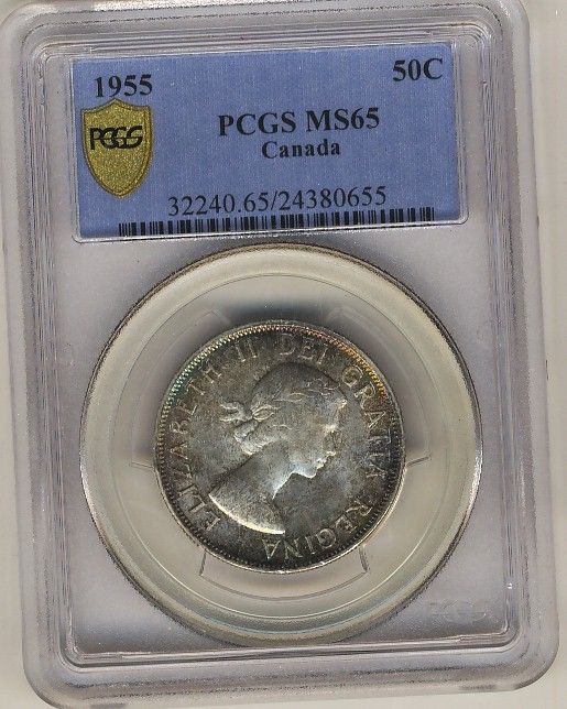1955 50 Cents PCGS MS65. Rainbow colours.