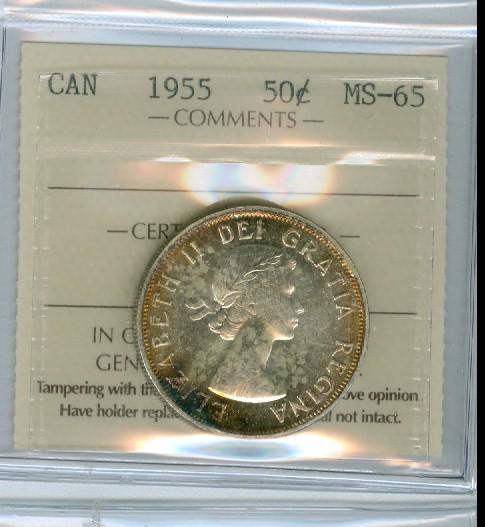1955 50¢ ICCS MS65. White with golden rim tone.
