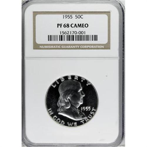 <B>1955 50C PR68 Cameo NGC.</B></I> NGC Census: (310/4). PCGS Population (49/0). Numismedia Wsl. Price for NGC/PCGS coin in PR68: $392. (#86696)<BR><BR><b>Shipping:</b> Coins & Currency (<a target="_blank" href="http://www.heritageauctions.com/common/shipping.php">view shipping information</a>\)