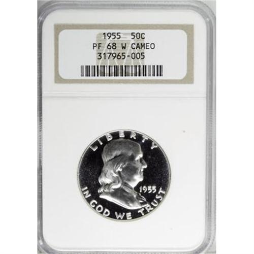 <B>1955 50C PR68 W Cameo NGC.</B></I> NGC Census: (313/4). PCGS Population (49/0). Numismedia Wsl. Price for NGC/PCGS coin in PR68: $392. (#86696)<BR><BR><b>Shipping:</b> Coins & Currency (<a target="_blank" href="http://www.heritageauctions.com/common/shipping.php">view shipping information</a>\)