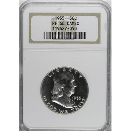<B>1955 50C PR68 Cameo NGC.</B></I> NGC Census: (313/4). PCGS Population (49/0). Numismedia Wsl. Price for NGC/PCGS coin in PR68: $392. (#86696)<BR><BR><b>Shipping:</b> Coins & Currency (<a target="_blank" href="http://www.heritageauctions.com/common/shipping.php">view shipping information</a>)