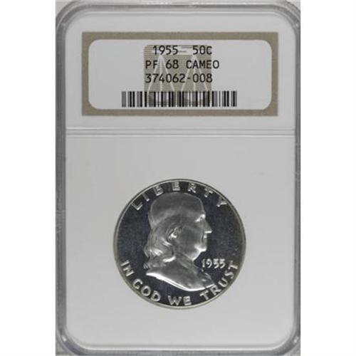 <B>1955 50C PR68 Cameo NGC.</B></I> NGC Census: (309/4). PCGS Population (48/0). Numismedia Wsl. Price: $392. (#86696)<BR><BR><b>Shipping:</b> Coin/Currency (<a target="_blank" href="http://www.heritageauctions.com/common/shipping.php">view shipping information</a>)