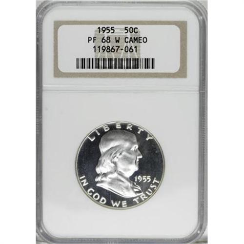 <B>1955 50C PR68 W Cameo NGC.</B></I> NGC Census: (317/4). PCGS Population (51/0). Numismedia Wsl. Price for NGC/PCGS coin in PR68: $400. (#86696)<BR><BR><b>Shipping:</b> Coins & Currency (<a target="_blank" href="http://www.heritageauctions.com/common/shipping.php">view shipping information</a>)