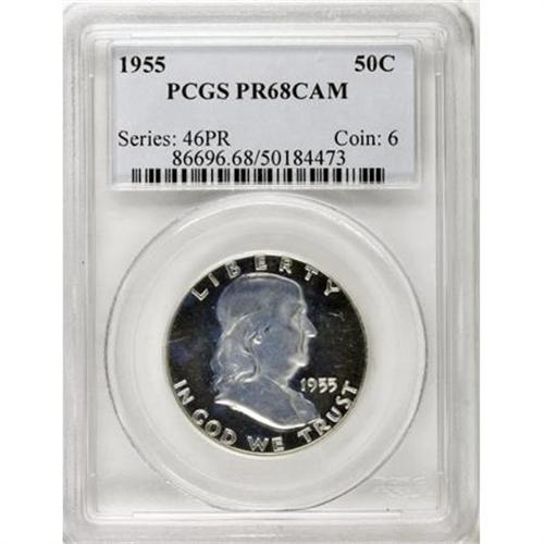 <B>1955 50C PR68 Cameo PCGS.</B></I> PCGS Population (51/0). NGC Census: (317/4). Numismedia Wsl. Price for NGC/PCGS coin in PR68: $400. (#86696)<BR><BR><b>Shipping:</b> Coins & Currency (<a target="_blank" href="http://www.heritageauctions.com/common/shipping.php">view shipping information</a>)