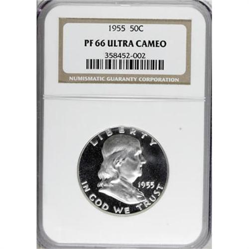 <B>1955 50C PR66 Deep Cameo NGC.</B></I> NGC Census: (20/60). PCGS Population (32/49). Numismedia Wsl. Price for NGC/PCGS coin in PR66: $650. (#96696)<BR><BR><b>Shipping:</b> Coins & Currency (<a target="_blank" href="http://www.heritageauctions.com/common/shipping.php">view shipping information</a>\)