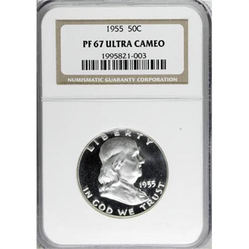<B>1955 50C PR67 Deep Cameo NGC.</B></I> NGC Census: (31/29). PCGS Population (35/14). Numismedia Wsl. Price for NGC/PCGS coin in PR67: $1,100. (#96696)<BR><BR><b>Shipping:</b> Coins & Currency (<a target="_blank" href="http://www.heritageauctions.com/common/shipping.php">view shipping information</a>\)