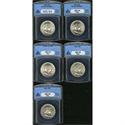 <B>1955 50C "Bugs Bunny" MS64 ANACS; 1955 "Bugs Bunny" MS64 Full Bell Lines ANACS; 1962-D MS65 Full Bell Lines ANACS; (2)1963 MS64 Full Bell Lines ANACS</B></I><BR><BR><B>Coin Engraver:</B> John R. Sinnock<BR><BR><b>Shipping:</b> Coin/Currency (<a target="_blank" href="http://www.heritageauctions.com/common/shipping.php">view shipping information</a>\)