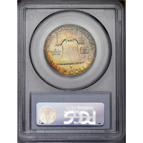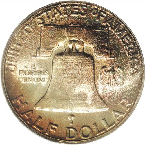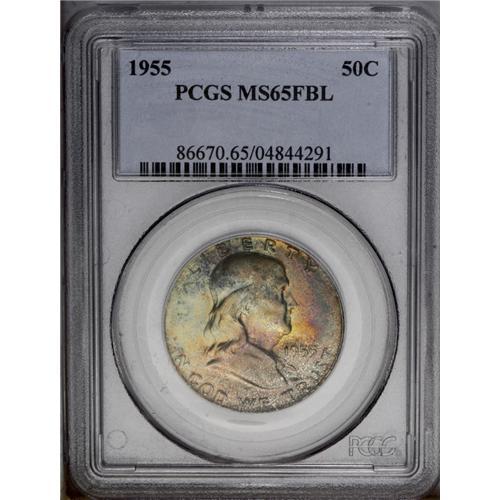 <B>1955<50C> MS65 Full Bell Lines PCGS.</B></I> Intensely toned with vivid olive, lilac, and blue color over frosty luster. This example is sharply struck with full details on both sides. <BR><BR><B>Important notice:</B> Heritage usually auctions material at the rate of 200-250 lots per hour. On some occasions eBay Live bid software or the Internet may not be able to keep up with the pace of the auction. We recommend placing a realistic absentee bid now as insurance to avoid disappointment. Occasionally the auctioneer may eliminate or reject an eBay Live bid, and the auctioneer may also reopen a lot after the close of the eBay live bidding (usually because we missed an audience bid), and may reject your bid even if it shows you as the winning bidder. By bidding via eBay Live, you agree that Heritage may award the lot to another bidder at its sole discretion under the circumstances described above or any other reasonable circumstances. Since eBay bids are not shown to us until we open the lot on the floor, we treat those bids just like floor bids. In most cases the floor responds before the eBay bid is presented to us, due to Internet lag time, so for consistency we have made it a policy that floor bids are always considered first over tie eBay live bids. Also please note that all Heritage lots purchased through eBay Live carry a 20% Buyer's Premium. Please make sure you read the Terms and Conditions before you bid. This lot is being auctioned in conjunction with a live floor auction by Heritage Galleries & Auctioneers. All final auction and invoice information will be supplied by Heritage Galleries & Auctioneers, and all other information should be considered preliminary. Lot:3112 <BR><BR><B>Winning Notification and Billing:</B> After the FINAL session in this auction is complete, Heritage will send e-mail and snail mail invoices. This process normally takes several days. All final auction and invoice information will be supplied by Heritage Galleries & Auctioneers, and all other information should be considered preliminary. <BR><BR>This auction will be conducted on a live auction floor and over the Internet through eBay Live. If you choose to place an absentee bid, please take a moment to <font color='#0000ff'><u><a href='http://pages.ebay.com/liveauctions/help/before/laabsentee.html'>learn how eBay Live absentee bidding works</a></u></font><font color='#000000'>